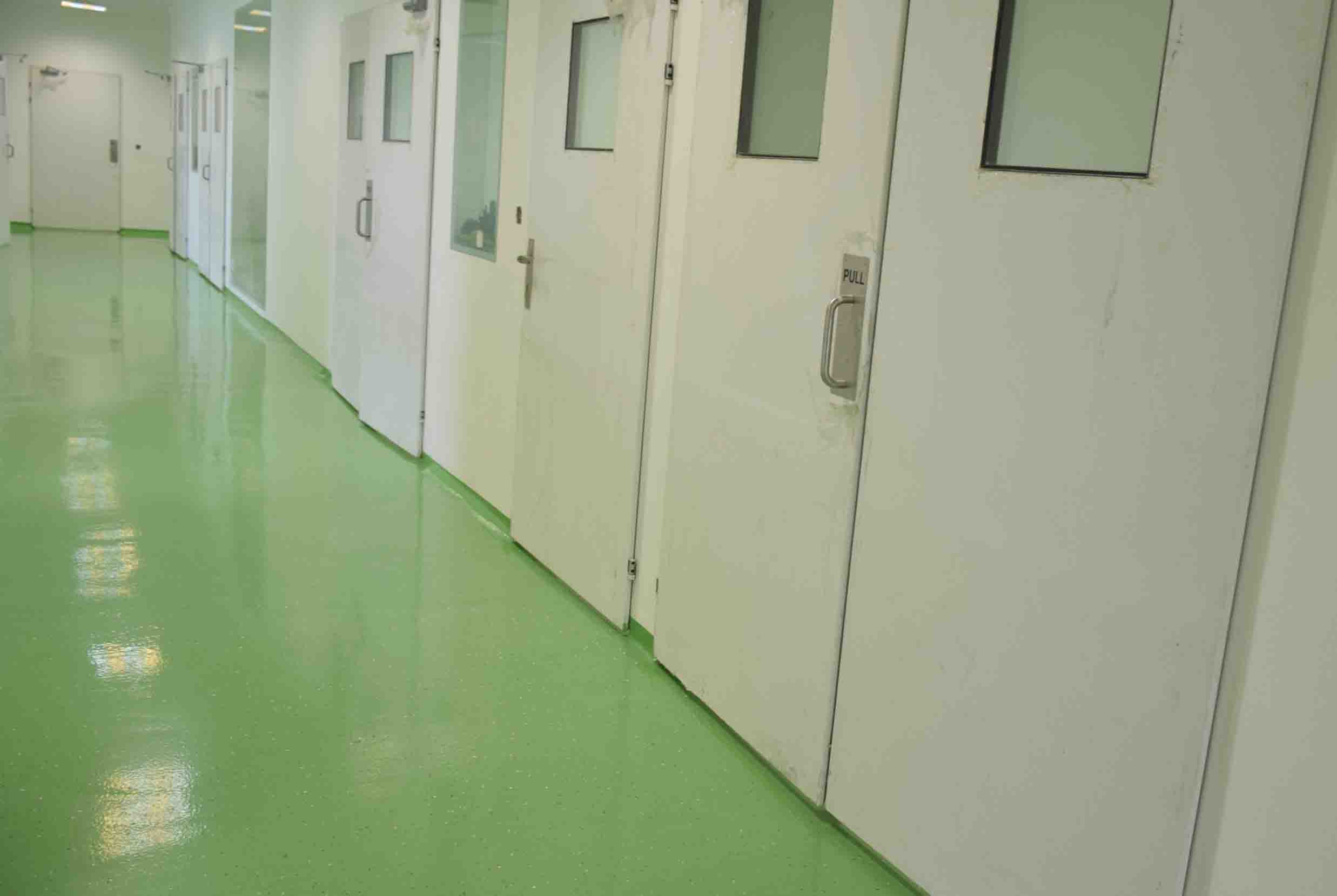به دلیل جابه جایی وسایل سنگین در این سالن و خطر افتادن آن ها بر روی کف، کفپوش سالن توزین داروسازی باید از مقاومت خوبی در برابر ضربه برخوردار باشد. همچنین، سطح کفپوش باید کاملاً صاف و صیقلی اجرا شود و نظافت و شستشوی آسانی داشته باشد.